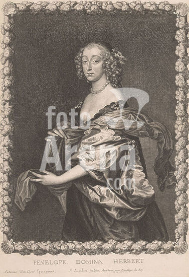 alb15936115 Portrait of Penelope Herbert in a decorated frame, Penelope. Domina Herbert (title on object), Portraits of Counts and Countesses (series title), print maker: Pierre Lombard, after painting by: Anthony van Dyck, publisher: Pierre Lombard, print maker: London, publisher: Paris, France, c. 1660 - c. 1663, paper, engraving, etching, height 346 mm × width 244 mm, print.