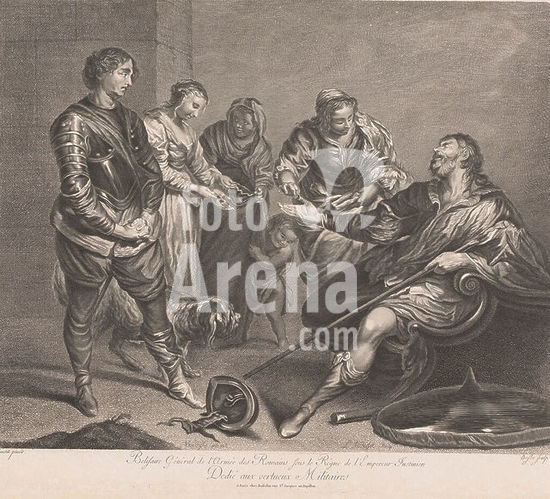 alb15936223 Belisarius, The blind Belisarius sits on a chair and holds out his right hand for alms. In front of him are three women with a child and a dog. A soldier watches., print maker: Louis Bosse, after painting by: Anthony van Dyck, publisher: V. Rosselin, print maker: France, publisher: Paris, c. 1767 - c. 1777, paper, engraving, etching, height 421 mm × width 490 mm, print.