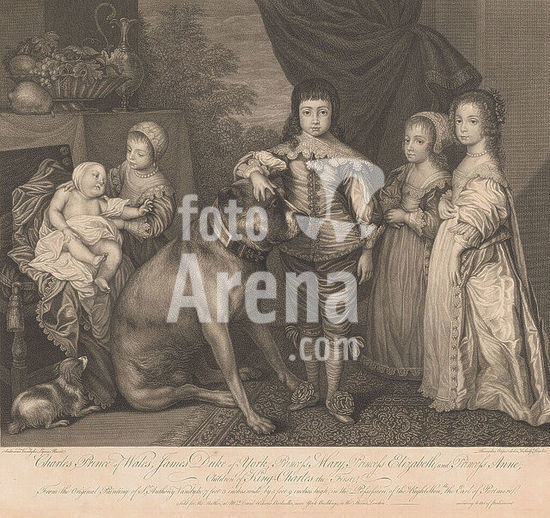 alb15936643 Portrait of five children of Charles I of England, Charles Prince of Wales, James Duke of York, Princess Mary, Princess Elizabeth, and Princess Anne; Children of King Charles the First (title on object), In the middle Karel stands with his hand resting on a dog. On the right are Jacobus and Maria Henriëtte. On the left is Elizabeth with Anne as a baby., print maker: Richard Cooper, after painting by: Anthony van Dyck, publisher: David Wilson, London, 1762, paper, etching, height 475 mm × width 532 mm, print.