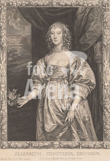 alb15940988 Portrait of Elizabeth Cavendish, Countess of Devonshire in decorated frame, Elizabeth. Comitissa Devoniae (title on object), Portraits of Counts and Countesses (series title), print maker: Pierre Lombard, after painting by: Anthony van Dyck, publisher: Pierre Lombard, London, c. 1660 - c. 1663, paper, engraving, etching, height 349 mm × width 243 mm, print.