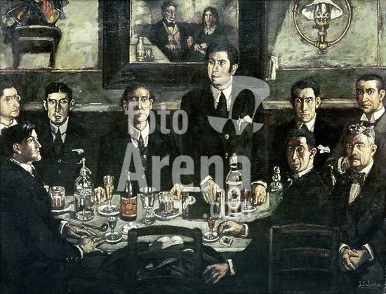 alb2012750 José Gutiérrez Solana / 'The Gathering at the Café de Pombo', 1920, Oil on canvas, 161.5 × 211.5 cm. Museum: Museo Nacional Centro de Arte Reina Sofía (MNCARS), MADRID, SPAIN. RAMON GOMEZ DE LA SERNA. TOMAS BORRAS. JOSE BERGAMIN. MANUEL ABRIL. JOSE CABRERO. MAURICIO BACARISSE. PEDRO EMILIO COLL. SALVADOR BARTOLOZZI.