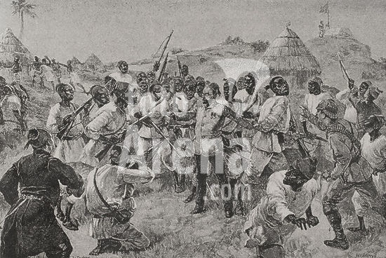 alb3680233 The Battle of Tonguzluq. Artist: Augustin de Saint-Aubin (French, Paris 1736-1807 Paris); after Giuseppe Castiglione (Italian, Milan 1688-1766 Beijing); (direxit) Charles Nicolas Cochin II (French, Paris 1715-1790 Paris). Dimensions: Sheet: 39 5/8 × 25 13/16 in. (100.7 × 65.5 cm)Plate: 37 × 22 3/4 in. (94 × 57.8 cm). Series/Portfolio: The Conquests of the Emperor of China(Les Conquêtes de l'Empereur de la Chine). Date: 1773.This print depicts the 1758 Battle of Tonguzluq with Qing soldiers firing cannons and using guns and arrows to attack the enemy within a fortified encampement filled with tents and yurts; outside the encampement, Qing soldiers set fire to enemy turrets and take prisoners.Part of a set of sixteen, "The Battle of Tonguzluq" was commissioned by the Qianlong Emperor in 1765 to commemorate Manchu victories (1755-59) over the Eleuths, the Dzungars, and other Central Asian peoples in the present-day region of Xinjiang. Made under the direction of Charles-Nicolas Cochin (1715-1790), the prints, which follow reduced-scale copies of paintings by Jesuit artists working in Beijing, were etched and engraved in France from 1767 to 1774 by the finest printmakers at the court of Louis XV. The Chinese merchants of Canton (present-day Guangzhou) paid for the copper plates and two hundred sets of prints to be delivered to China, with only a few sets retained in Paris.The prints exemplify the fusion of Eastern and Western representational styles fostered within the Qing imperial painting academy. The European technique of chiaroscuro-the modeling of forms through the use of light and shading-has been visibly tempered, as has the use of one-point perspective. Instead, the scenes present panoramic views and strongly up-tilt ground planes. At the same time, howevery, they reflect European preferences for anatomical accuracy, a single light source, and the mathematically correct reduction of scale to create the illusion of recession. Museum: Metropolitan Museum of Art, New York, USA.