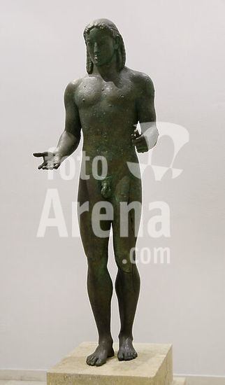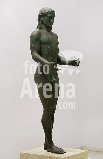 alb21207151 Piraeus Apollo. Ancient Greek bronze sculpture in the archaic style. Dated ca. 530-520 BC. Detail. Archaeological Museum of Piraeus. Greece.