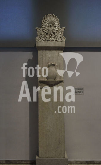 alb21207128 Ancient Greece. Detail of the grave stele of the brothers Sosimenes and Socrates, from the deme of Athmonon. The funerary urn is depicted as a small jug on the relief loutrophoros. First half of the 4th century BC. Archaeological Museum of Piraeus. Greece.