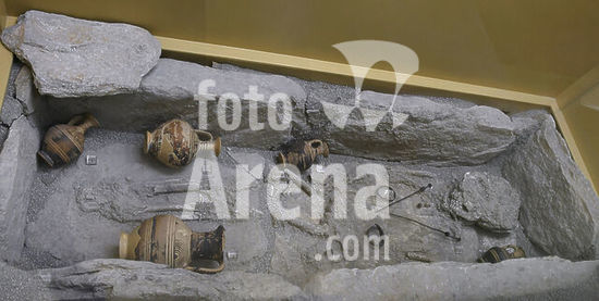 alb23131259 Ancient Greece. Protogeometric burial of a girl, about 1000 BC. The grave was found beneath the northern end of the Stoa of Attalos, in the Agora of Athens. The trench, dug in the soft bedrock, was lined with stone slabs to form a cist, a type of individual funerary monument that became into common use towards the end of the Mycenaean Period. The body laid face up, with its head facing south. The girl wore a bronze bracelet on each wrist and a bronze ring on a finger of her left hand. Three small oil flasks and one medium-sized flask, as well as a wine pitcher, were placed beside the body. The grave was covered with a layer of stones. Museum of the Ancient Agora. Athens, Greece.
