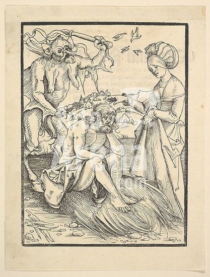 alb3616560 Job Tempted by a Demon. Artist: Hans Baldung (called Hans Baldung Grien) (German, Schwäbisch Gmünd (?) 1484/85-1545 Strasbourg (Strassburg)). Dimensions: Block: 6 1/4 × 4 5/8 in. (15.8 × 11.8 cm)Sheet: 7 3/8 × 5 9/16 in. (18.7 × 14.1 cm). Date: 1509. Museum: Metropolitan Museum of Art, New York, USA.