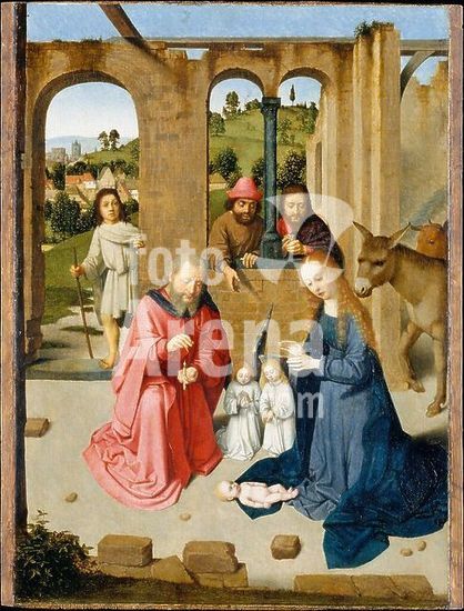 alb3743341 The Nativity. Dated: c. 1450. Dimensions: painted surface: 127.6 x 94.9 cm (50 1/4 x 37 3/8 in.) overall (panel): 130 x 97 cm (51 3/16 x 38 3/16 in.) framed: 149.2 x 118.4 cm (58 3/4 x 46 5/8 in.). Medium: oil on panel. Museum: National Gallery of Art, Washington DC. Author: PETRUS CHRISTUS.