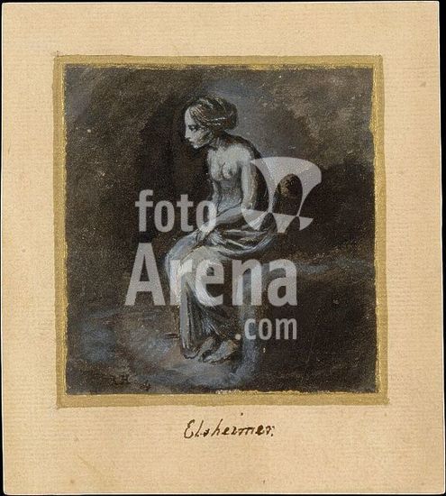 alb3619864 Seated Young Woman. Artist: Adam Elsheimer (German, Frankfurt 1578-1610 Rome). Dimensions: 2 15/16 x 2 13/16 in. (7.5 x 7.2 cm). Date: late 16th-early 17th century.Seated alone in deep shadow, this partially draped young woman might be Bathsheba, whom King David spied upon and seduced, or Susanna, who was caught bathing in her garden by two lascivious church elders. Diminutive here, she appears enormously vulnerable. Adam Elsheimer was the most singular and influential German artist to follow Dürer. It was especially the poetic atmosphere and the meticulous, miniature-like execution, as one can see in this very fine gouache, that were much admired by the next generation of artists, among which were Peter Paul Rubens and Rembrandt. Museum: Metropolitan Museum of Art, New York, USA.