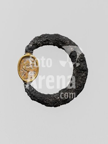 alb3632932 Silver swivel ring with ivory scarab in gold setting. Culture: Cypriot or Phoenician. Dimensions: 3/8 × 9/16 × 3/4 in. (1 × 1.4 × 1.9 cm)Diameter: 2 in. (5.1 cm). Date: 7th-early 5th century B.C..Swivel ring with Egyptian ivory scarab; cartouche of Men-kheper-ra between a winged ureus, and a crowned king who kneels and makes an offering. Museum: Metropolitan Museum of Art, New York, USA.