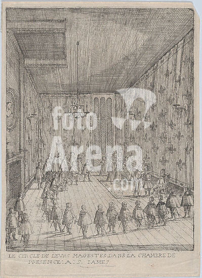alb3655123 Le Cercle De Leurs Magestes Dans La Chambre De Presence: A: S. Iames; illustration from 'Histoire de l'entrée de la Reyne Mère dans la Grande Brètaigne'. Artist: Anonymous, French, 17th century. Dimensions: Sheet: 11 1/16 in. × 8 in. (28.1 × 20.3 cm). Date: 1639.Charles I, Henrietta Maria, their children, and Marie de Medici, with attendants, in St. James's Palace. Illustration from the book, 'Histoire de l'entrée de la Reyne Mère dans la Grande Brètaigne', by Jean Puget de la Serre (London, 1639). See 37.19.1(a, b). Museum: Metropolitan Museum of Art, New York, USA.