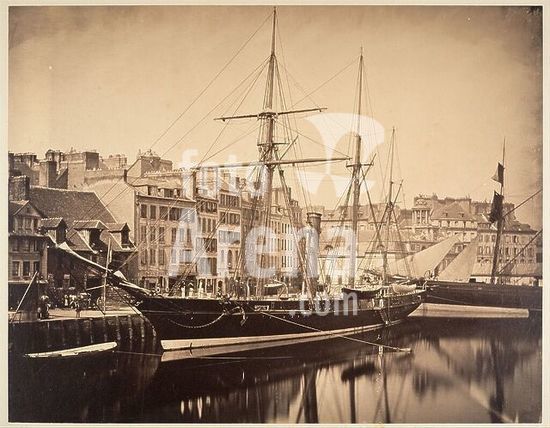 alb3657890 La Reine Hortense - Yacht de l'empereur, Havre. Artist: Gustave Le Gray (French, 1820-1884). Dimensions: Image: 31.8 x 41.3 cm (12 1/2 x 16 1/4 in.)Mount: 53.1 x 66.3 cm (20 7/8 x 26 1/8 in.). Date: 1856.Le Gray photographed the imperial yacht in the port of Le Havre in July 1856, just before it set off for Greenland and Spitzbergen on an expedition led by Prince Napoleon. The sleek vessel's rigging and guys seem to secure its perfect placement within Le Gray's frame.In the late 1840s, Le Gray had helped perfect the paper negative process and the salted paper print, using to aesthetic advantage their tendency to exaggerate light and shadow and to impart a soft graininess to the picture. But in this photograph, and in the dramatic seascapes that followed and that won him international renown, Le Gray used a new technique-the glass plate negative and the albumen silver print-to achieve a limpid atmosphere, extreme clarity of detail, and flawless surface. Museum: Metropolitan Museum of Art, New York, USA.