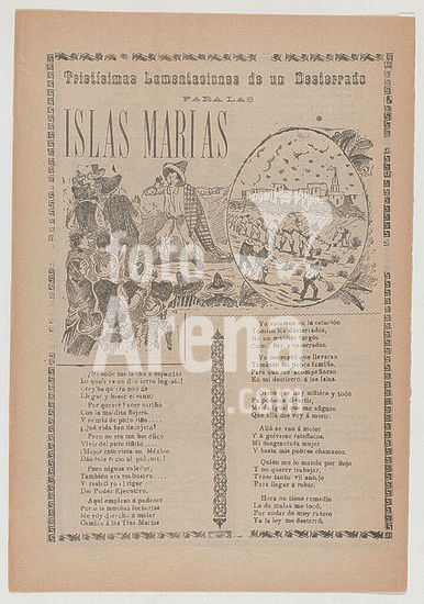 alb3659123 Broadsheet relating to sad lament of those exiled to the prison on the Islas Marias, corrida in the bottom section. Artist: José Guadalupe Posada (Mexican, 1851-1913). Dimensions: Sheet: 11 13/16 × 7 15/16 in. (30 × 20.2 cm). Publisher: Antonio Vanegas Arroyo (1850-1917, Mexican). Date: 1908. Museum: Metropolitan Museum of Art, New York, USA.