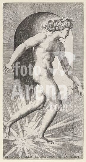 alb3680013 Plate 11: Apollo riding his chariot in a niche, facing right, from a series of mythological gods and goddesses. Artist: Giovanni Jacopo Caraglio (Italian, Parma or Verona ca. 1500/1505-1565 Krakow (?)); After Rosso Fiorentino (Italian, Florence 1494-1540 Fontainebleau). Dimensions: Sheet: 8 5/16 × 4 5/16 in. (21.1 × 11 cm). Series/Portfolio: Series of mythological gods and goddesses. Date: 1526. Museum: Metropolitan Museum of Art, New York, USA.