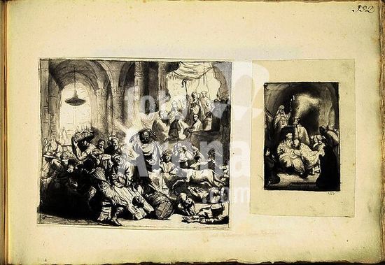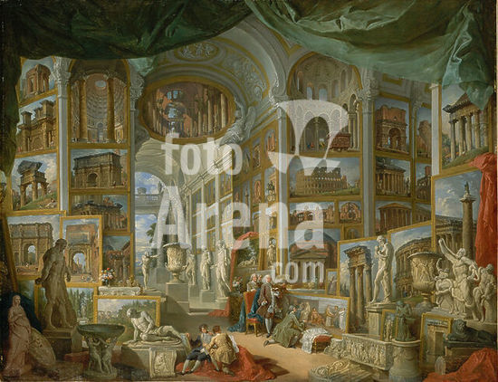 alb3680059 Ancient Rome. Artist: Giovanni Paolo Panini (Italian, Piacenza 1691-1765 Rome). Dimensions: 67 3/4 x 90 1/2 in. (172.1 x 229.9 cm). Date: 1757.Ancient Rome is a pendant to Modern Rome and shows the most famous antique monuments in the city. It was commissioned by the Count de Stainville, later the Duke de Choiseul, who is at the center with a guidebook in hand. Panini shows himself behind the chair. The gentlemen are admiring a copy of an ancient fresco. The Pantheon, the Coliseum, Trajan's column, the Farnese Hercules, and the Laocoön may be identified. For the identification of the other monuments, visit metmuseum.org. Museum: Metropolitan Museum of Art, New York, USA. Author: Giovanni Paolo Panini.