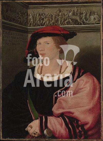 alb3680412 Benedikt von Hertenstein (born about 1495, died 1522). Artist: Hans Holbein the Younger (German, Augsburg 1497/98-1543 London). Dimensions: Overall 20 1/2 x 15 in. (52.4 x 38.1 cm); painted surface 20 3/8 x 14 5/8 in. (51.4 x 37.1 cm). Date: 1517.In 1517 Holbein decorated the house of the Lucerne magistrate Jacob von Hertenstein. Concurrently, he made this portrait of the magistrate's eldest son, Benedikt, who engages the viewer both with his direct glance and the inscription, which reads as if he is speaking: "When I looked like this I was twenty-two years old." Directly following these words is the declaration that "H.H." painted the work. The artist's use of paper mounted on wood is unusual but not unique. He initiated the portrait as a drawing on paper and then continued working up in oil colors to its completion. Museum: Metropolitan Museum of Art, New York, USA.