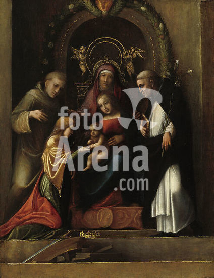 akg234413 Lotto, Lorenzo; c. 1480 - 1556. "Polyptych from Recanati", 1508. (Middle paneel: Mary with Child and Saints Dominic, Gregory and Urban; Side panel: St. Thomas Aquinas and Flavian, Peter Martyr and Veit, Lucia and Vincenzo Ferrer, Catharine of Siena and Sigismund; above: Pietà). Oil on wood. Recanati, Pinacoteca Civica. Museum: Recanati, Pinacoteca Civica.