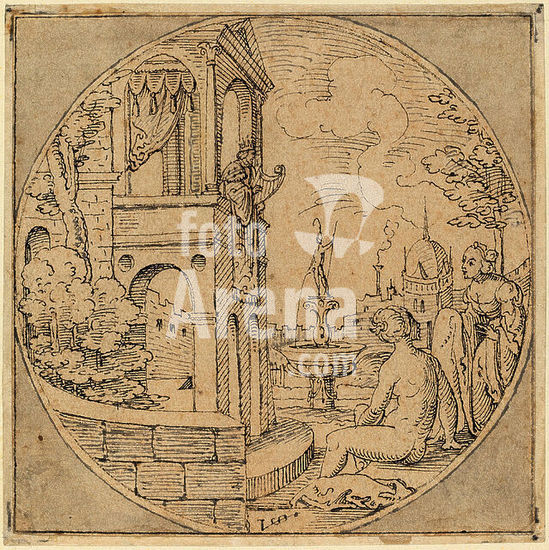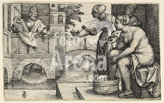 alb4131611 Bathsheba at the Bath. Heinrich Aldegrever; German, 1502-c.1560. Date: 1527-1537. Dimensions: 145 x 99 mm (image/plate/sheet). Engraving in black on ivory laid paper. Origin: Germany. Museum: The Chicago Art Institute, USA.