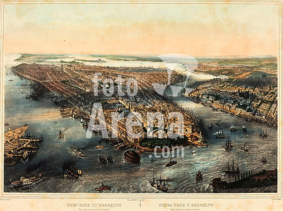 alb3724863 New York et Brooklyn - Vue prise au dessus dela batterie. Medium: hand-colored lithograph. Museum: National Gallery of Art, Washington DC. Author: Theodore Muller after William Simpson.