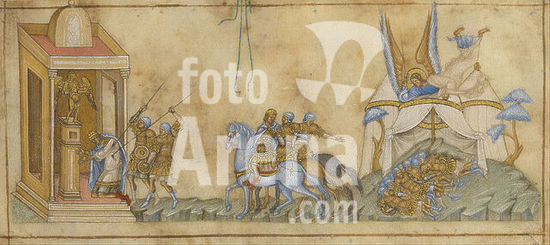 alb3890136 The Death of Sennacherib. Date/Period: Ca. 1300. Detached leaf. Tempera colors and gold on parchment. Height: 73 mm (2.87 in); Width: 175 mm (6.88 in). Author: UNKNOWN.