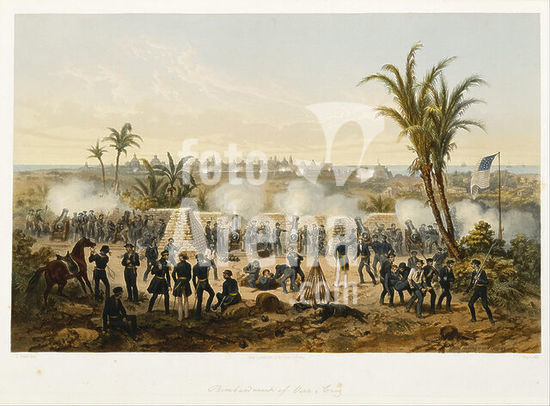 alb3890888 Bombardment of Vera-Cruz. Date/Period: 1851. Hand-colored lithograph on wove paper. Height: 34.3 cm (13.5 in); Width: 46.4 cm (18.2 in). Author: ADOLPHE JEAN-BAPTISTE BAYOT. CARL NEBEL.