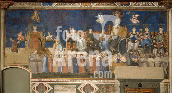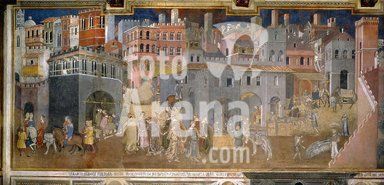 akg254816 Spinello Aretino, byname for Spinello di Luca Spinelli; c. 1336 - 1410. "Saint Benedict receives the King of the Goths, Totila, and prophesies his destiny", aft. 1387. Fresco. 15th picture of a cycle with scenes from the life of Saint Benedict. Florence, S.Miniato al Monte, sacristy, south wall, lower row, left.