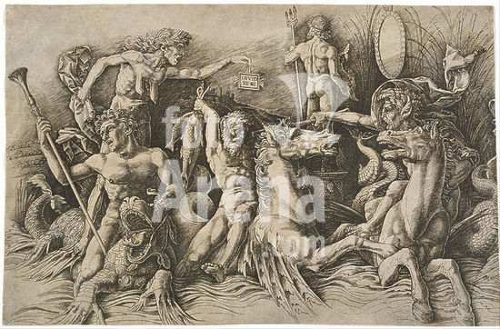 alb3631169 Battle of the Sea-Gods (right half). Artist: Andrea Mantegna (Italian, Isola di Carturo 1430/31-1506 Mantua). Dimensions: Sheet (Trimmed): 11 5/8 × 15 1/2 in. (29.5 × 39.4 cm). Date: ca. 1485-88. Museum: Metropolitan Museum of Art, New York, USA.