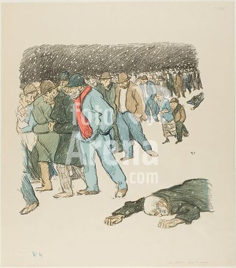 alb4160962 Misery Under the Snow. Théophile-Alexandre Steinlen (French, born Switzerland, 1859-1923); printed by Edouard Kleinmann (French, 1844-1927). Date: 1894. Dimensions: 302 × 328 mm (image); 434 × 385 mm (sheet). Lithograph in black with stenciled colors (green, blue, red and tan) on cream wove paper. Origin: France. Museum: The Chicago Art Institute, USA. Author: Théophile-Alexandre Pierre Steinlen.