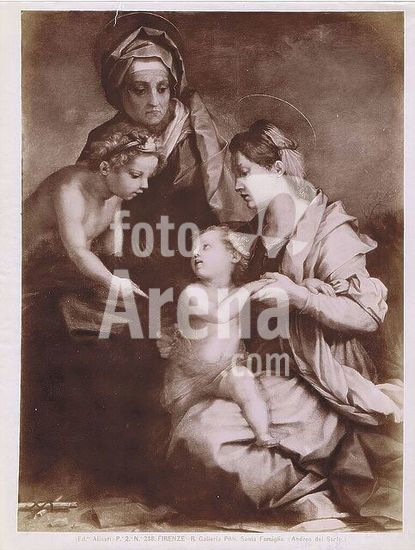 alb5151540 Andrea del Sarto: Holy Family (Sacra Famiglia Medici). Galleria Palatina, Palzzo Pitti, Florence, albumin paper, black and white positive process, image size: height: 25.00 cm; width: 19.30 cm, FIRENZE - Galleria Pitti. Santa Famiglia (Andrea del Sarto.) Verso round stamp, painting, Mary with Christ Child (Madonna), Elizabeth, John the Baptist (life and deeds).