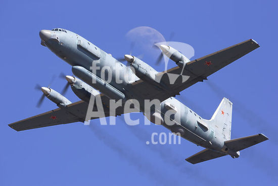 alb5572533 Tu-142MZ anti-submarine airplane in formation with Sukhoi Su-33 jet fighters of the Russian Navy flying over Saint Petersburg, Russia.