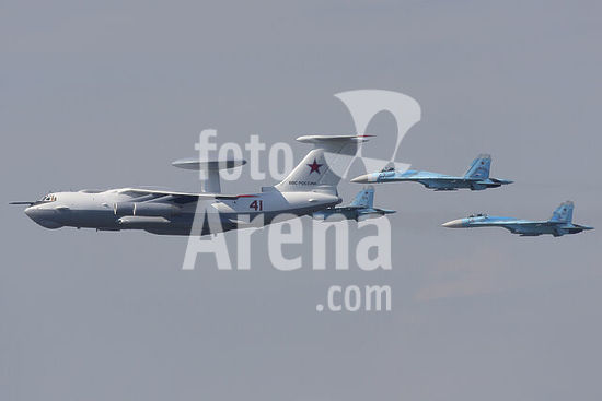 alb5572110 Group of an A-50 AWACS airplane and Su-27 jet fighters of Russian Air Force during Victory Day parade, Moscow, Russia.