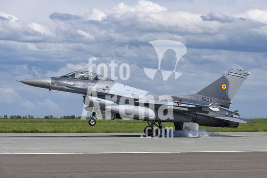 alb5572190 Romanian Air Force F-16AM Fighting Falcon, improved to mid-life upgrade (MLU) 5.2R standard, landing at 86th Air Base, Borcea, Romania, home of the 53rd Fighter Squadron.