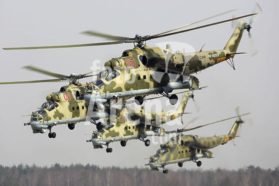 alb5572531 Mil Mi-24P attack helicopters of the Russian Air Force departing for a parade rehearsal, Kubinka, Russia.