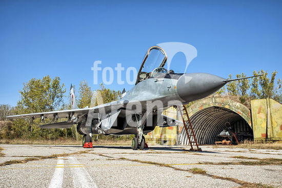 alb5572565 Bulgarian Air Force MiG-29 fighter jet parked in front of the aircraft shelters at Graf Ignatievo Air Base, Bulgaria.