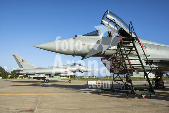 alb5572568 Italian Air Force F-2000A Typhoon aircraft, front to front on the ramp at Trapani Air Base, Italy.