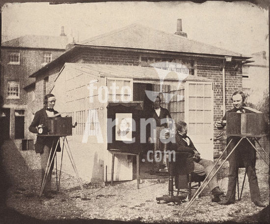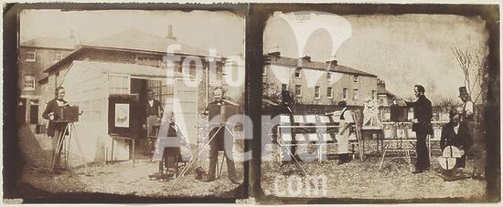 alb3678672 [The Reading Establishment]. Artist: Attributed to William Henry Fox Talbot (British, Dorset 1800-1877 Lacock); Attributed to Nicolaas Henneman (Dutch, Heemskerk 1813-1898 London). Dimensions: Left image: 18.6 x 22.4 cm (7 5/16 x 8 13/16 in.)Right image: 18.1 × 22 cm (7 1/8 × 8 11/16 in.)Overall sheet: 19.9 × 49.1 cm (7 13/16 × 19 5/16 in.). Date: 1846.The widespread distribution of large editions of photographic prints was the promise of Talbot's negative-positive process and its principal advantage over the contemporaneous French daguerreotype. In early 1844, in an effort to encourage the mass production of paper photographs, Talbot supported Nicolaas Henneman, his former valet, in the creation of the first photographic printing firm, situated in the town of Reading. It was there that prints for The Pencil of Nature were produced. The activities of the Reading establishment are shown here: Talbot, operating the camera at the center, makes a portrait, while at the right Henneman photographs a sculpture of the Three Graces. Other employees copy an engraving, stand attentively with a second camera back-loaded with sensitized paper, attend the racks of glass frames in which negatives and photographic paper are sandwiched for printing in sunlight, and adjust a device likely intended to aid focusing. Museum: Metropolitan Museum of Art, New York, USA.