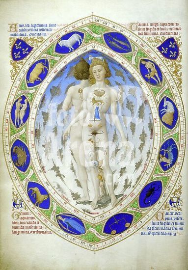 alb352309 Les Tres Riches Heures du Duc de Berry, French 15th century, Zodiac and anatomy of man and woman. Museum: Victoria & Albert Museum, LONDRES, UK.