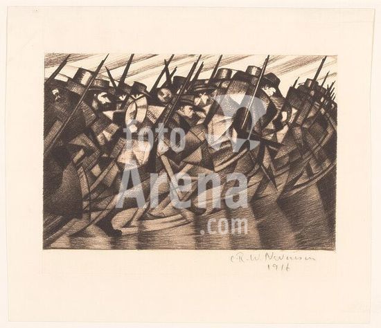 alb3638186 Returning to the Trenches. Artist: Christopher Richard Wynne Nevinson (British, London 1889-1946 London). Dimensions: Plate: 6 in. × 8 1/16 in. (15.2 × 20.4 cm)Sheet: 8 3/8 in. × 11 in. (21.3 × 28 cm). Date: 1916.Unable to enlist in the British army for health reasons, Nevinson volunteered in fall 1914 for a Red Cross ambulance unit serving northern France and Belgium. Here, he conveys the dynamism of a seemingly impenetrable line of French soldiers, or poilus, whom?he probably encountered. Dressed in their distinctive uniform, they advance with purpose and determination, an effect amplified by the faceted forms that convey a sense of endless, repetitive movement. Individual features are minimized and further obscured by capes, hats, raised bayonets, and bladelike shields, while the broad, sweeping strokes that depict the men's lower bodies unify the group. Nevinson made a painting, drawings, and a woodcut of this image; the woodcut appeared in the war issue of the journal Blast. Museum: Metropolitan Museum of Art, New York, USA.