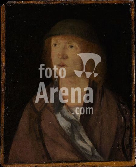 alb3672324 Portrait of a Young Man; (reverse) Girl Making a Garland. Artist: Hans Süss von Kulmbach (German, Kulmbach ca. 1480-1522 Nuremberg). Dimensions: 7 x 5 1/2 in. (17.8 x 14 cm). Date: ca. 1508.Hans Süss von Kulmbach had been apprenticed to the Italian painter and printmaker Jacopo de' Barbari, who worked at a number of German courts in the first decade of the sixteenth century. The latter's influence must have continued even after Kulmbach joined Dürer's Nuremberg studio in 1507, since this portrait of an unidentified young man, which dates from about 1508, is stylistically very close to Barbari's earlier Portrait of a Man (Kunsthistorisches Museum, Vienna). The panel is unique in Kulmbach's oeuvre, as it joins a portrait with an allegorical subject on the verso. Reverse label: This charming genre depiction represents a girl making a garland of forget-me-nots, one of which lies on the windowsill. A decoratively trailing banderole above reads, in translation, "I bind with forget-me-nots." Symbolizing a lover or prospective bride, the young maiden seems to address the young man who appears on the other side of the panel, promising to bind her heart faithfully to him. The prominently placed cat--a symbol of respectable, constant love in the art of the period-- also refers to her commitment and affection. Museum: Metropolitan Museum of Art, New York, USA.