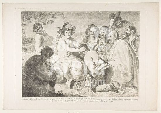 alb3674027 The Drunkards, after Velázquez. Artist: Goya (Francisco de Goya y Lucientes) (Spanish, Fuendetodos 1746-1828 Bordeaux); After Velázquez (Diego Rodríguez de Silva y Velázquez) (Spanish, Seville 1599-1660 Madrid). Dimensions: Plate: 12 1/2 × 16 15/16 in. (31.7 × 43.1 cm)Sheet: 14 1/8 × 16 1/4 in. (35.8 × 41.3 cm). Date: 1778. Museum: Metropolitan Museum of Art, New York, USA.