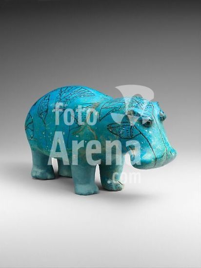 alb3674503 Hippopotamus ("William"). Dimensions: L. 20 cm (7 7/8 in.); W. 7.5 cm (2 15/16 in.); H. 11.2 cm (4 7/16 in.). Dynasty: Dynasty 12. Reign: Senwosret I to Senwosret II. Date: ca. 1961-1878 B.C..This well-formed statuette of a hippopotamus (popularly called "William") demonstrates the Egyptian artist's appreciation for the natural world. It was molded in faience, a ceramic material made of ground quartz. Beneath the blue glaze, the body was painted with the outlines of river plants, symbolizing the marshes in which the animal lived.The seemingly benign appearance that this figurine presents is deceptive. To the ancient Egyptians, the hippopotamus was one of the most dangerous animals in their world. The huge creatures were a hazard for small fishing boats and other rivercraft. The beast might also be encountered on the waterways in the journey to the afterlife. As such, the hippopotamus was a force of nature that needed to be propitiated and controlled, both in this life and the next. This example was one of a pair found in a shaft associated with the tomb chapel of the steward Senbi II at Meir, an Upper Egyptian site about thirty miles south of modern Asyut. Three of its legs have been restored because they were probably purposely broken to prevent the creature from harming the deceased. The hippo was part of Senbi's burial equipment, which included a canopic box (also in the Metropolitan Museum), a coffin, and numerous models of boats and food production.The hippo's modern nickname first appeared in 1931 in a story that was published in the British humor magazine Punch. It reports about a family that consults a color print of the Met's hippo--which it calls "William"--as an oracle. Museum: Metropolitan Museum of Art, New York, USA.