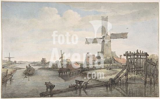 alb3681605 View of a Canal with Three Windmills. Artist: Jan Hulswit (Dutch, Amsterdam 1766-1822 Nieuwer-Amstel). Dimensions: sheet: 8 1/8 x 13 1/8 in. (20.7 x 33.4 cm). Date: late 18th-early 19th century. Museum: Metropolitan Museum of Art, New York, USA.