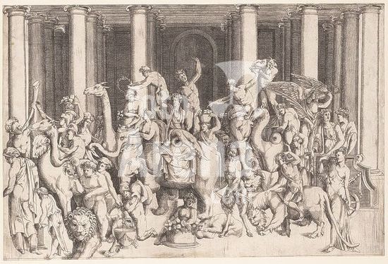 alb3683621 The Indian Triumph of Bacchus. Artist: Attributed to Enea Vico (Italian, Parma 1523-1567 Ferrara) , after an ancient relief sculpture. Dimensions: sheet: 12 3/8 x 18 1/2 in. (31.5 x 47 cm) Print trimmed 1/8 in. below. Date: ca. 1542. Museum: Metropolitan Museum of Art, New York, USA.