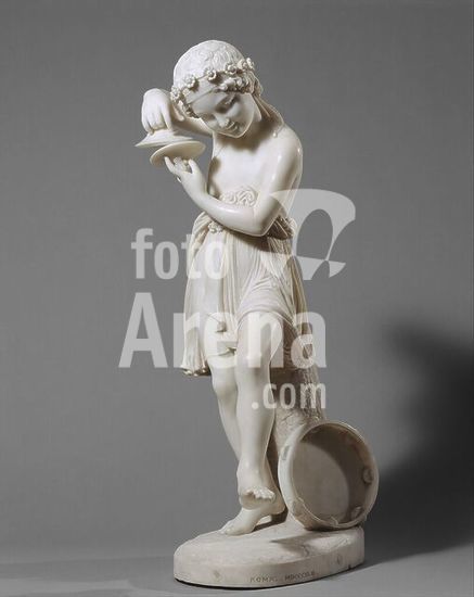 alb3684269 Genius of Mirth. Artist: Thomas Crawford (American, New York 1813?-1857 London). Dimensions: 47 x 20 x 24 in. (119.4 x 50.8 x 61 cm). Date: 1842; carved 1843.During a visit to Crawford's Rome studio in 1842, the New Yorker Henry Hicks gave him an order for a sculpture, leaving the theme to the artist's choosing. Crawford's selection of a lighthearted youth was likely to please his patron, as images of children were especially popular in the mid-nineteenth century. He described his subject as "a boy of seven or eight years, dancing in great glee, and tinkling a pair of cymbals, the music of which seems to amuse him exceedingly." The sculptor and his contemporaries relished the technical challenges of carving marble; the disengaged raised left leg epitomizes the virtuosity they delighted in displaying. Museum: Metropolitan Museum of Art, New York, USA.