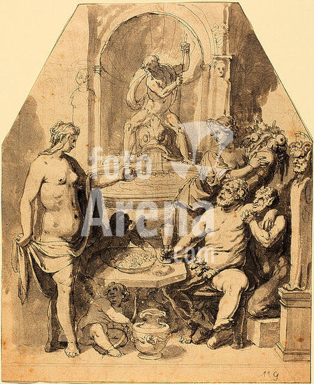 alb3738797 Without Ceres and Bacchus, Venus Freezes. Dated: 1590s. Dimensions: overall (hexagonal): 27.2 x 22.1 cm (10 11/16 x 8 11/16 in.). Medium: pen and black ink with gray wash over graphite on laid paper. Museum: National Gallery of Art, Washington DC. Author: Johann Matthias Kager.