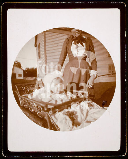 alb3890361 Baby in carriage, woman standing behind. Date/Period: 1890/1900. Gelatin silver print, Kodak #2 snapshot. Width: 9.1 cm. Height: 9 cm (Image). Author: Unidentified photographer.