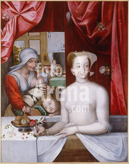 alb3897319 Gabrielle d'Estrées au bain. Date/Period: From 1598 until 1599. Painting. Oil on canvas. Height: 1,150 mm (45.27 in); Width: 1,030 mm (40.55 in). Author: French school.