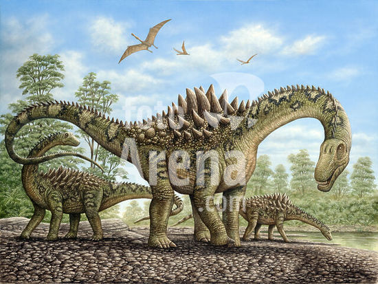 alb5568987 Pteranodon reptiles fly over a herd of Puertasaurus dinosaurs visiting a pond during the Cretaceous Period of Patagonia.