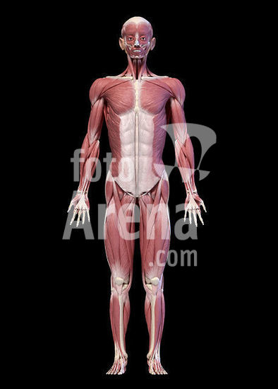 alb5568478 3D illustration of male muscular system, full body, front view on black background.