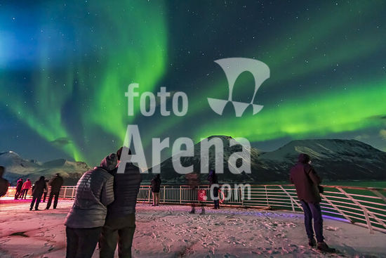 alb5568492 October 19, 2019 - A fine display of aurora in curtains across the north, observed from the upper Deck 9 of the MS Trollfjord on the southbound voyage north of Tromso along the Norwegian coast. Illumination is partly from the waning gibbous moon.