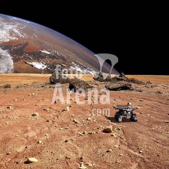 alb5568495 A robotic rover explores a geological feature of a rocky and barren alien world. A large cloud covered planet rises over the airless environment.